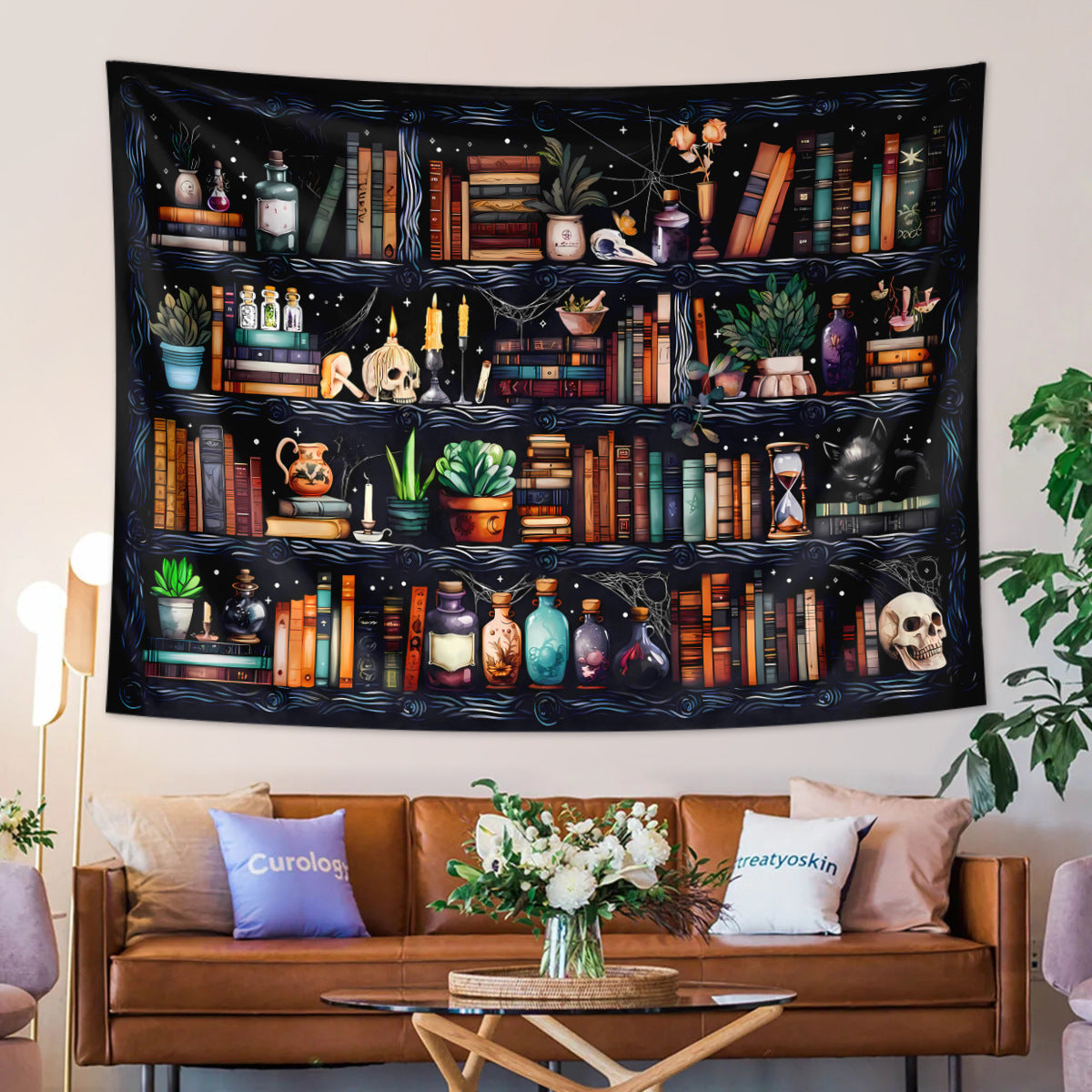 Dive into a world where stories come alive—this tapestry transforms any wall into a whimsical portal. Adorned with vibrant details: dusty tomes, glowing potion bottles, curious plants, and timeless skulls, all set against a starry, swirling backdrop. Every shelf tells a tale, blending mystery with cozy charm.