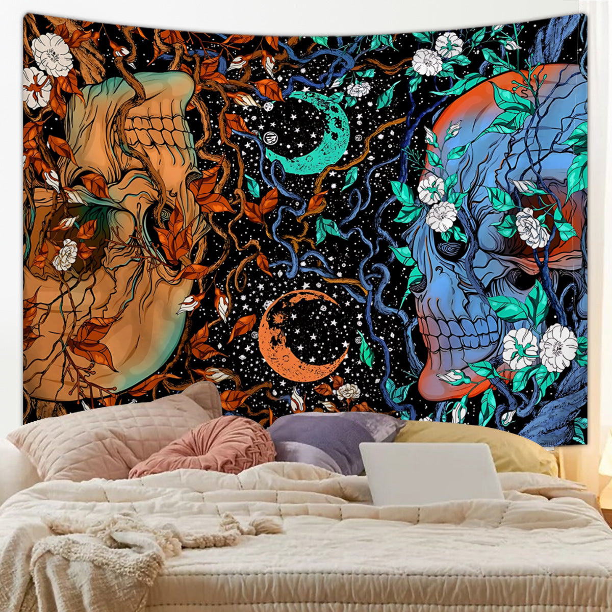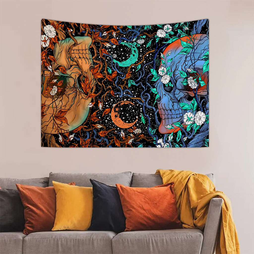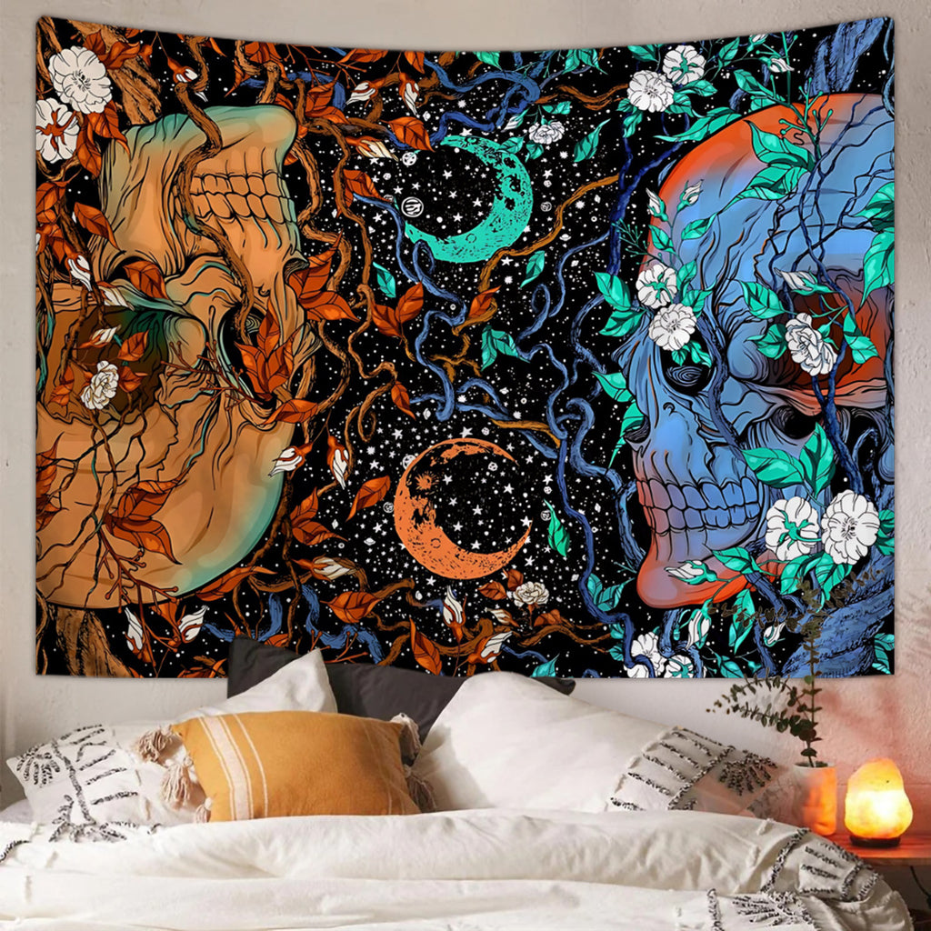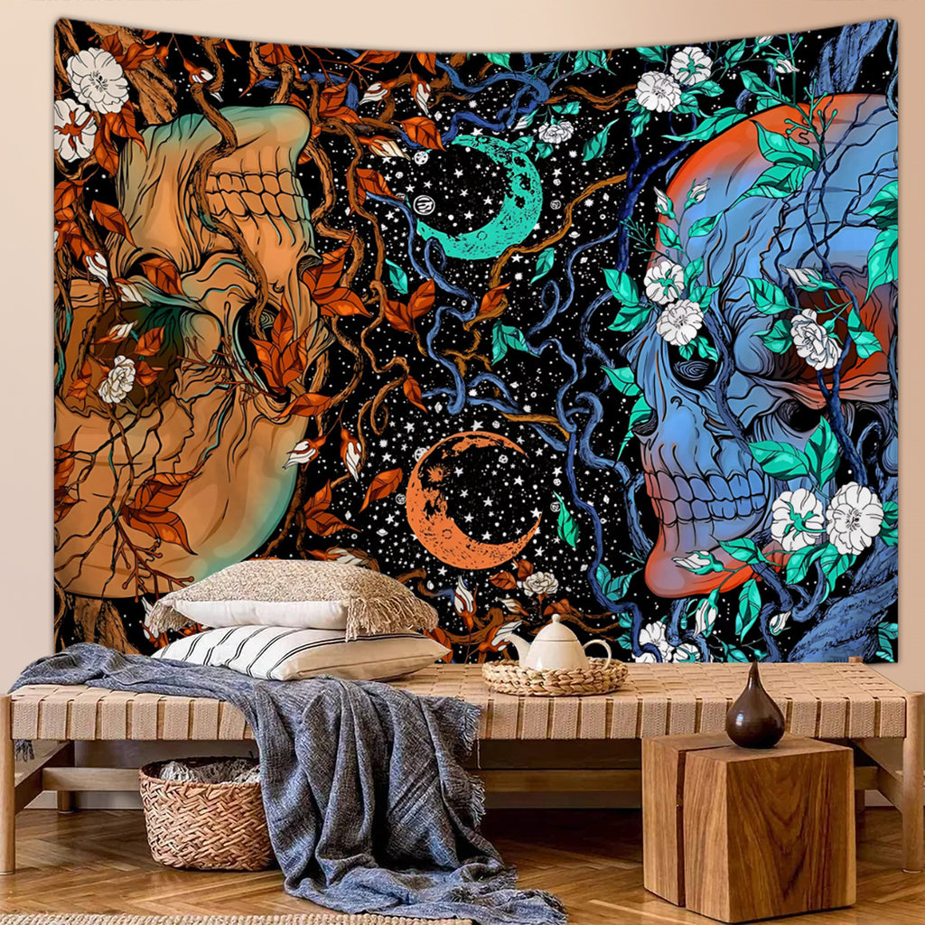 Ethereal Realm Tapestry: Where Skulls Meet Blooms in Cosmic Harmony