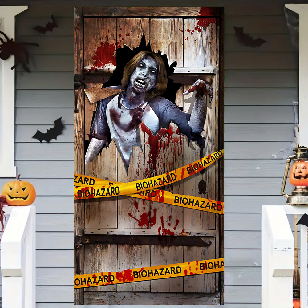 ✅ Intimidating Design: A menacing zombie bursts through a distressed wooden door, splattered with fake blood and torn edges—complete with "BIOHAZARD" caution tape for max scare factor.