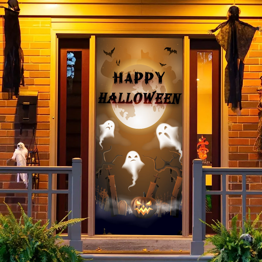 Creepy-Charming Design: Haunting ghosts, glowing pumpkins, and a full moon create instant spooky vibesāperfect for residential, storefronts, or office doors.