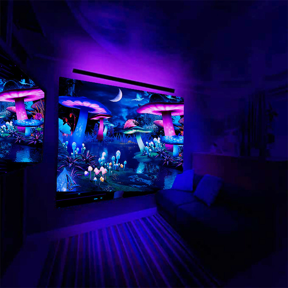 🌌Use this magical mushroom forest UV tapestry to turn your space into a sparkling dreamlike landscape. Under the purple light, this tapestry is filled with glowing giant mushrooms, glowing poisonous mushrooms, sparkling moonlight ponds, and ethereal flying creatures, creating an immersive fantasy world directly from the surreal fairy tale.