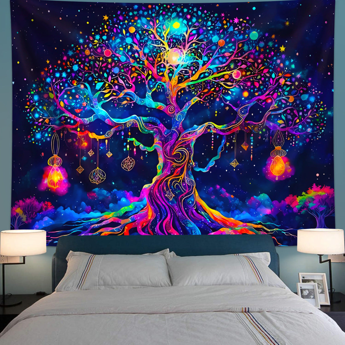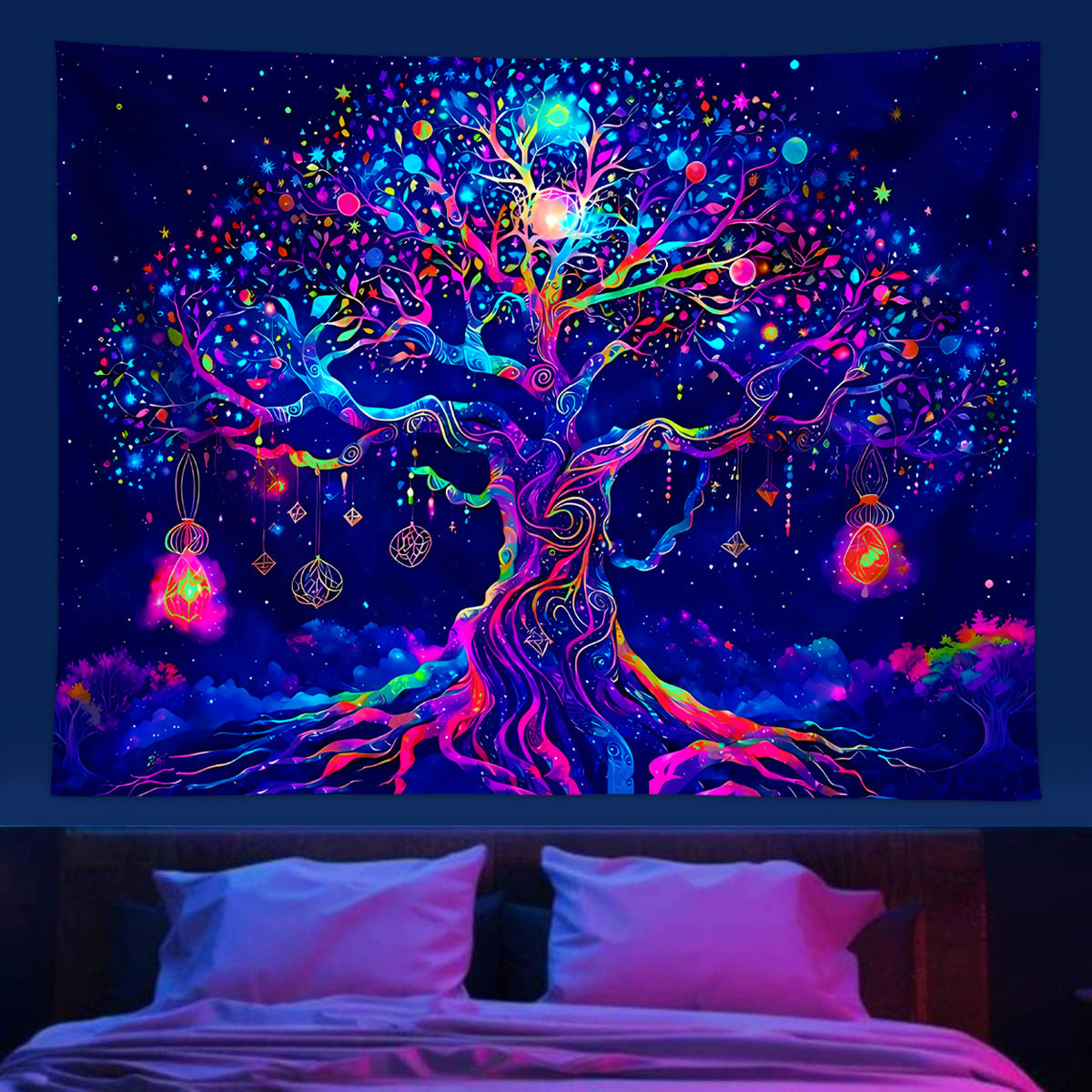 💜Breathtaking Artistry: Dive into a kaleidoscope of colors—electric blues, magentas, and neon greens swirl around a glowing Tree of Life, its branches adorned with stars, planets, and crystalline orbs. Every intricate detail is hand-painted, inviting you to lose yourself in its cosmic storytelling.