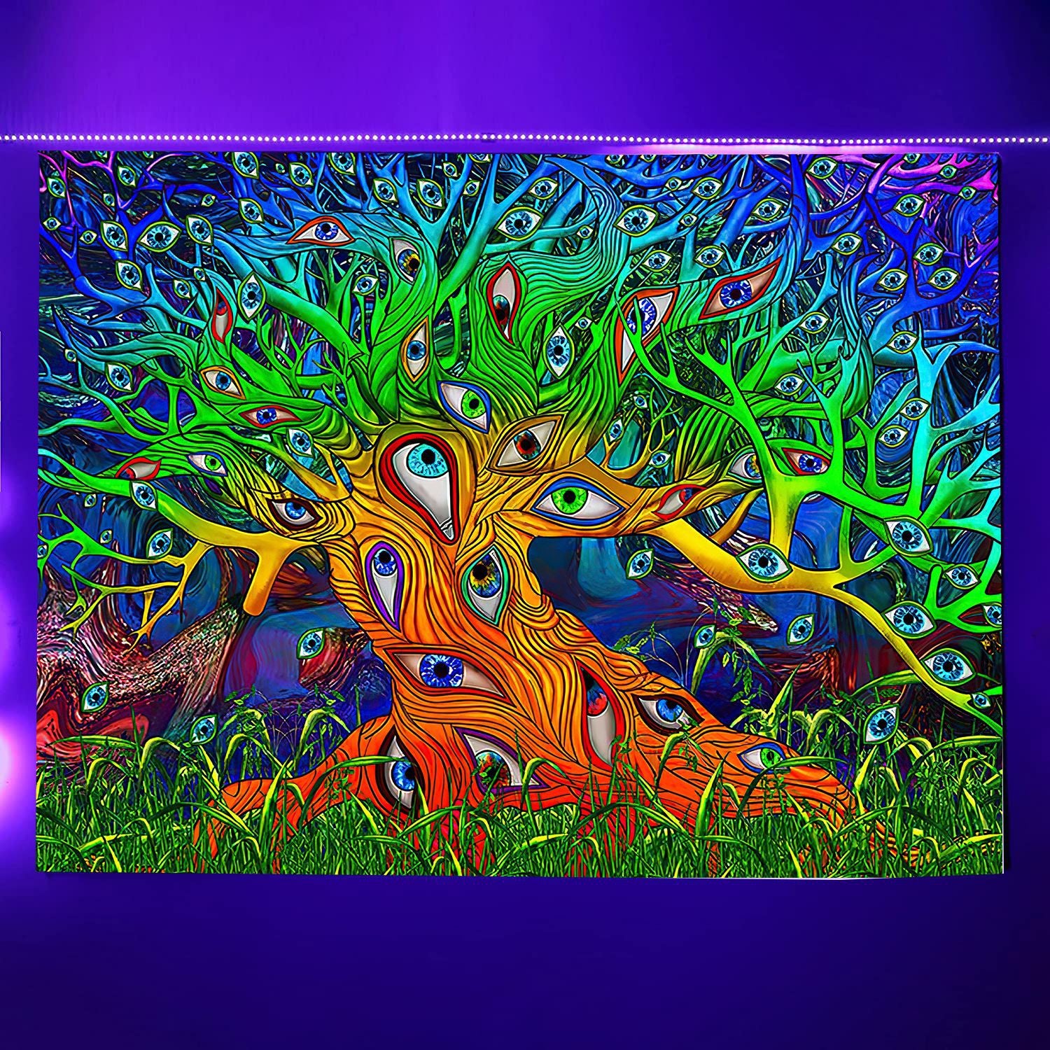Tapisserie réactive UV à lumière noire psychédélique représentant un arbre omniscient