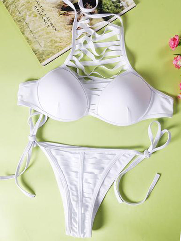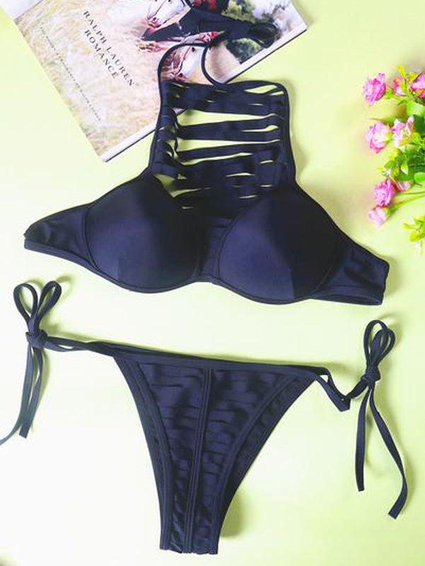 Les ensembles de bikini licou en filet de couleur unie seront un ajout adorable à votre collection de maillots de bain.