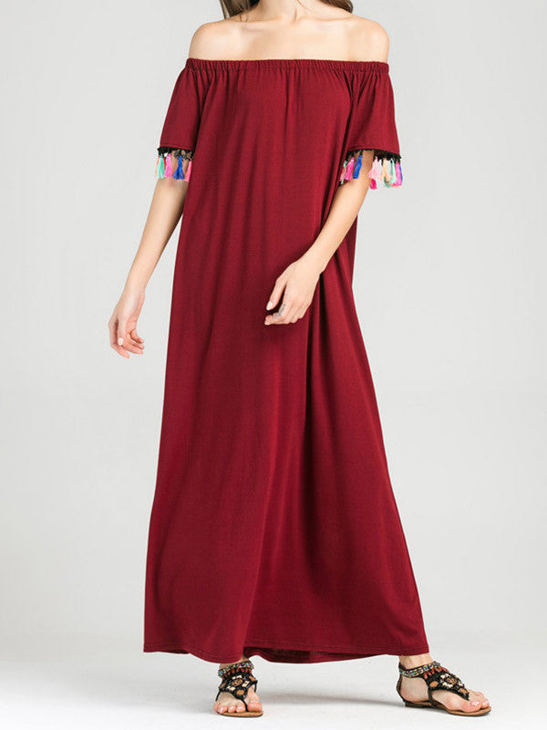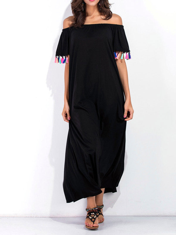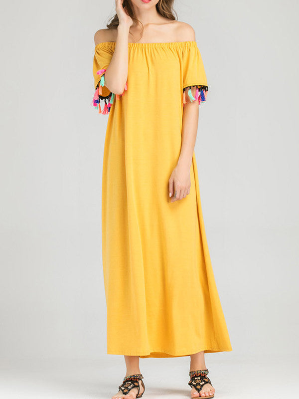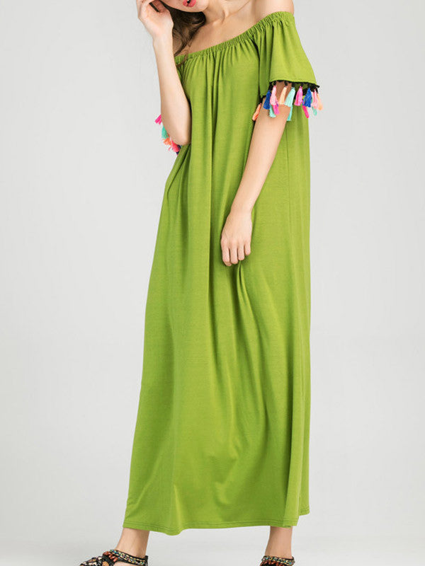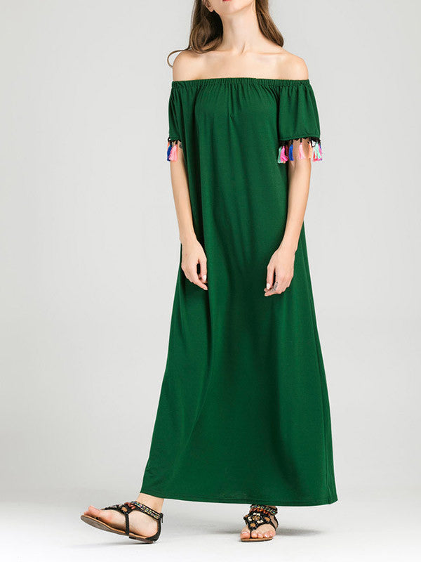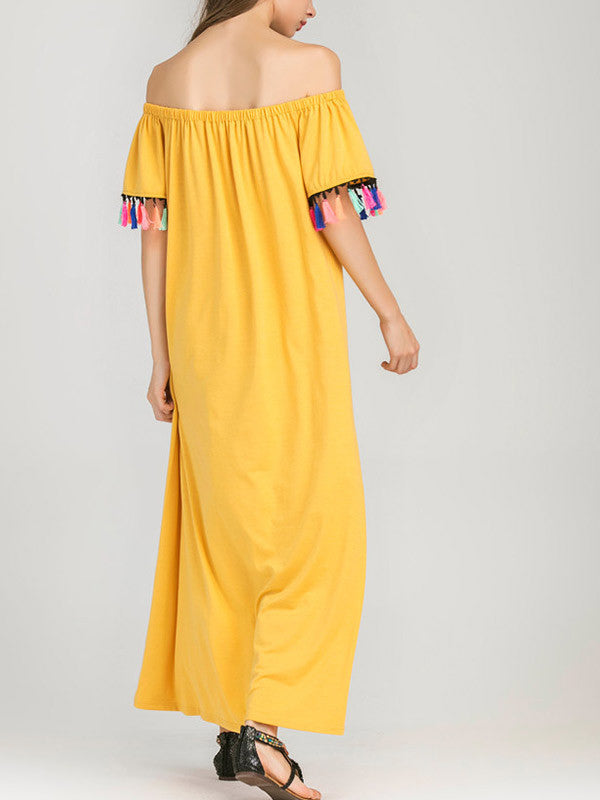 Leisure Off Shoulder Short Sleeve Tassel Maxi Dress