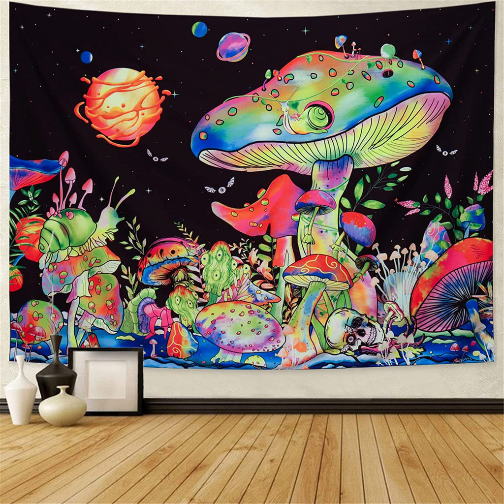 🪐This mesmerizing UV Blacklight Tapestry features an enchanting blend of glowing mushroom clusters and a surreal collection of planets drifting through a star-filled sky.