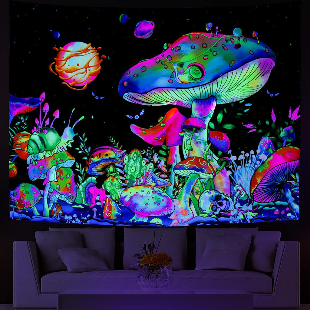 Reactive Mushroom And Planet Cluste BlackLight UV Reactive Tapestry