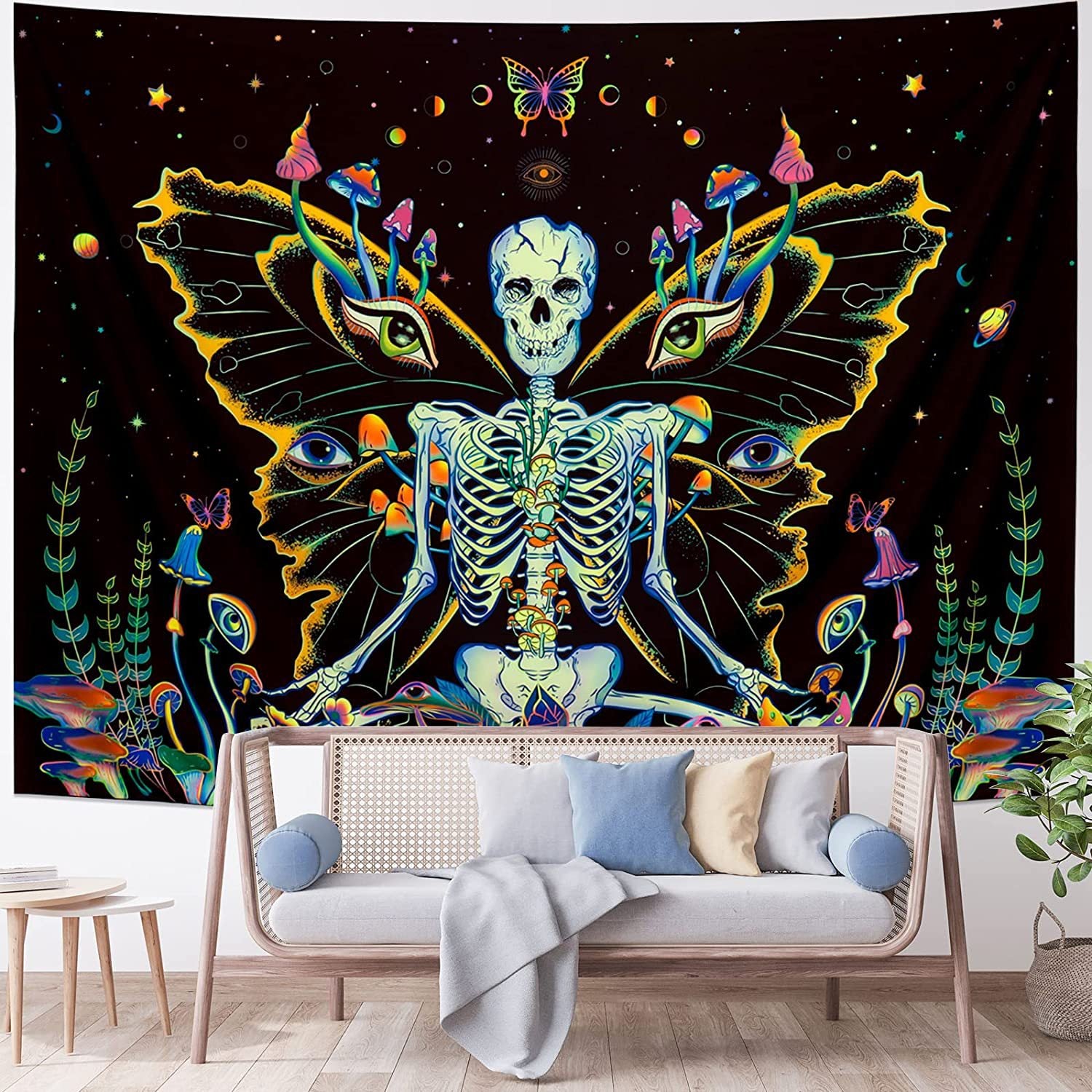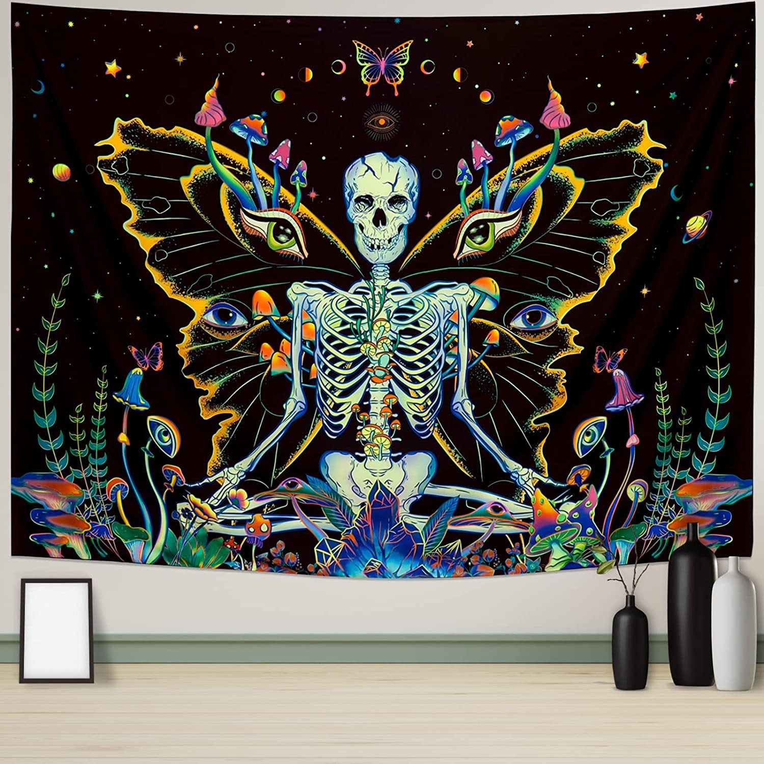 š¦Enter the dream realm. This mesmerizing UV Reactive Purple Glow Tapestry features a luminous skeleton with butterfly wings, surrounded by glowing mushrooms, all-seeing eyes, cosmic symbols, and surreal landscapes. Under blacklight, it bursts to life in electric blues, purples, and neon greens ā a true statement piece for any space.
